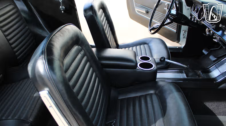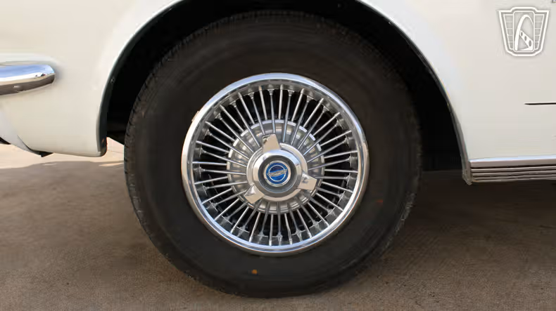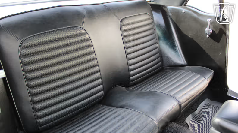 The details of this Mustang are a testament to its classic appeal. The hub caps add a touch of vintage flair, while the seatbelts provide a reassuring sense of security. Every element of the car, from the stitching on the vinyl seats to the gleam of the brightwork, invites you to take your time and enjoy the ride.